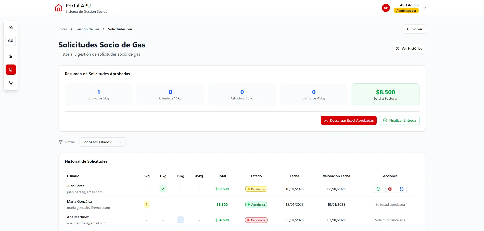 Vista de Gestión de Solicitudes de Gas: Gestión de Solicitudes de Gas - Interfaz simplificada para presentar y rastrear solicitudes de subsidio de gas. Los usuarios pueden cargar documentación, rastrear el estado de aprobación y recibir notificaciones en tiempo real a través del sistema integrado de Formularios de Praxsuite.